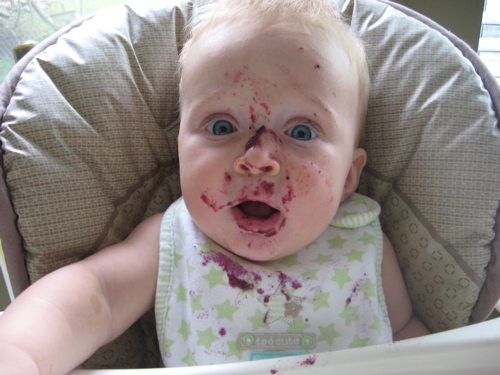 At thirty-six weeks, Jonas is: cutting his first tooth; getting really adept at going from a sitting position to a crawling position and back again; adding blueberries (what a MESS by the way…I actually stripped him down to his diaper for this one on Daddy’s wise recommendation and still ended up having to just put him in the tub afterwards…here’s picture proof) and nectarines (the first food he’s ever tried that had him smiling after the first bite) to his fruit repertoire; breaking out into a sweat with all of his playful floor activities and new skill honing; and perfecting his crawling jag (he has been getting really good on advancing forward on his knees…he’s still figuring out how to involve his arms, although he has managed to get one in there for a lopsided crawl a time or two…I’m sure it won’t be long and he’ll be putting on the turbo).Â