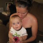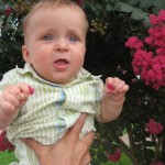 Jonas is quite the naturalist. Â From very early on in his life, he has always seemed to enjoy going for a nice stroll around the neighborhood. Â Being outside has a way of calming him down…he just looks around and takes it all in. Â There are a few places on our morning and evening walks, where he reaches his hand out when he sees tall grass or plants up ahead (it reminds me of the Gladiator and the field of wheat). Â He’ll often come back from his walks with a leaf or a piece of grass in his hand, holding it like a prize. Â One morning, he went for a walk with Daddy and brought me this flower from our yard. Â 🙂 Â And here he is with the most beautiful crepe myrtle on our street.