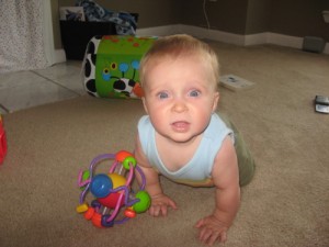 At thirty-eight weeks, Jonas is: experimenting with more finger foods (peaches rolled in crushed Cheerios and egg yolks); enjoying Mommy’s creativity expressed in pureed fruit mixes (he’s still not into vegetable mixes); trying his darnedest to stand up from a crawling position; cutting another tooth; continuing to get super excited whenever he sees a dog (especially Petra); deciding to enter the consonant/vowel babbling world with gle-gle-gle and guy-guy-guy (he’s a very verbal little mister and has been entertaining us with his own version of talking and communicating since he was born)Â ; and finding new and improved ways of rolling away from the diaper change.