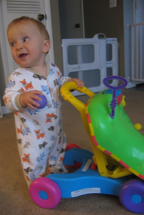 In his forty-fifth week, Jonas is: setting a new record with his hands-free balance time at 10 seconds (while clapping at the same time); trying lentils and asparagus (they both get the “meh” Jonas rating); continuing to practice his first words (“DaDa” for Daddy, “dah” for dog, and “NaNa” for Momma); waving like a champ (especially when it comes to saying goodbye to Daddy in the morning); laughing out loud all the time; feeding Petra Cheerios and cracking up at her puppyish antics; and amazing us with his newfound dexterity of (gleefully) walking behind his walking toy without much assistance.