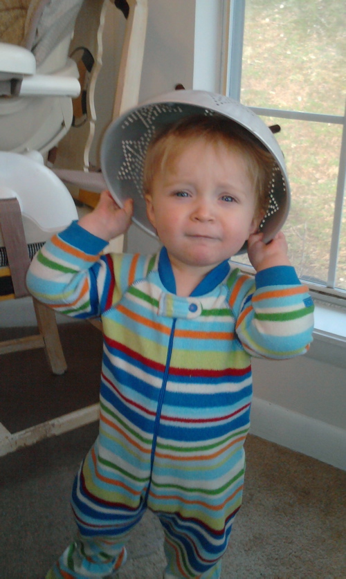 In his sixteenth month, Jonas is:  adding even more words to his already amazing vocabulary (“tee” for “tree”, “goo guh” for “good girl”, “choo” for “shoe”, “cap” for “clap”, “cah” for “(dog) collar”, “momah” for “snowman”, “moh” for “more”, “i yah” for “i love you”, “tall” for “tall” and “talk”, “two”, “crakah” for “cracker”, “coo coo” for “cookie”, “ih neh” for “empty”, “aht” for “hot”, “no no”, “gentuh” for “gentle”, “nih nih” for “night night”, “peace” for “peace”, “piece”, and please”; and “wal-mah” for “wal-mart”); using a few new signs (“all done”, “change diaper”, and “thank you”); making valiant (if messy) efforts to use a spoon; spending more time scribbling with crayons than trying to eat them; wildly enjoying games of chase with DaDa and Petra; being a brave boy with his biggest boo boo to date (he fell at the dog park when he was running towards me and out came the largest goose egg on his forehead that I have ever seen); turning into quite the little spontaneous, heart-melting, snuggle bunny; going up the stairs walking instead of crawling; showing us all of the “no nos” in the house with a quick run to the site of offense and a passionate “no no” upon arrival; pointing to himself when you ask him where Jonas is; and continuing to explode with personality.
