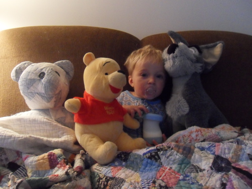 Jonas and His Friends… November 1, 2010November 14, 2010 Jodi Uncategorized Here is an early morning picture of Jonas, after just waking, with his favorite “friends” (Teddy Bear, Pooh Bear, and Tramp). They are toted up and down the stairs with care on a daily basis for nap time and bed time.