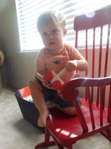 In his thirteenth month, Xander is: saying “cacka” for “cracker”; striking out on the dairy trial (back to the drawing board for another three months); developing a fascination for shape sorting toys, putting things in/taking things out of containers, and matching lids (he goes through the tupperware cabinet, finds the water bottles and sippy cups, and matches them up with the correct lids); closing doors; doing windshield wiper head when he’s really happy; and dancing (bouncing up and down).