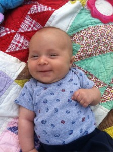 At nine weeks, Roman is: loving being outside (he loves going for walks in the Bjorn and taking naps in his bouncy on the porch); punching his arms and kicking his legs with wide open eyes in his awake time; enjoying music and the noise of his brothers; and moving his whole body in agreement with his light-up-the-world smiles.