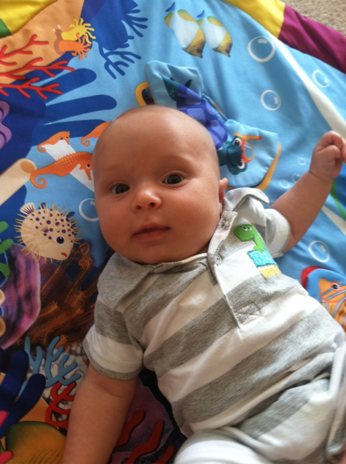 At twelve weeks, Roman is: recovering from his cold; continuing to be super aware and alert during his awake time (Jonas calls him “wide-eyed baby”); and lighting our world up with his smiles.