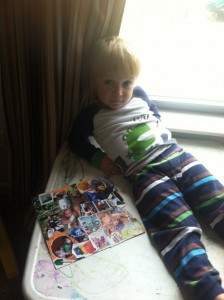 He painted it with watercolor. I printed off some pictures for him (Jonas riding his tricycle, digging in the sandbox, hanging out in the garden, planting a blueberry bush with Xander, reading books with Roman, playing in the treehouse with Daddy and his brothers, going strawberry picking with Mommy and his brothers, etc.). We looked through magazines together, and he picked out things he liked. (At first, I cut them out, and then I remembered that it was his project and that he could totally do it by himself so I ditched those and let him do the rest). He cut some of his favorite things out like books (one about gardening and a Mo Willems book about Piggie…he LOVES those), gardening tools, Thomas the Tank Engine, a sight words DVD (he’s been learning some of those this summer), an orange (orange juice is his favorite), and a puppet family. He also cut out the pictures of his family and his favorite things to do. He put glue on the back of each piece, handed them to me, and pointed to where he wanted them to go. It looks great!!! He’s so proud and can’t wait to show it to his teacher and his classmates.