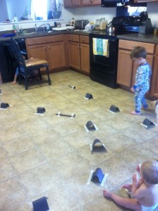 The boys and I have been taking it SUPER easy since the holidays, resting up from an event heavy season. So, I thought I would bust out a fun activity idea this morning (yes, I saw it on Pinterest)… Indoor Counting Croquet…perfect for a rainy day. Jonas was all about writing the numbers himself (he used the Little Writer tracing app when he got stuck on the how-to), Xander had just as much fun stomping on the construction paper hoops as he did hitting the ball through them, and Roman mostly enjoyed just trying to eat the masking tape. Ha!