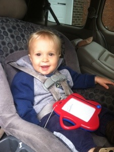 In his fourteenth month, Roman is: doing the signs for light and up; nodding yes with much deliberation; saying “up”, “ut” for “out”, “ap” for “apple”, and “ope” for “open”; using “ah-guh” and passionate grunts and gestures as his main mode of communication (“oatmeal” is more like “oh-guh”, “cheese” sounds like a very nasal “ch”, and “JoJo” is “guh-guh”); waving to us at meal times and kicking off the prayer by putting both hands up in the air; going to sleep awake for naps and bed time; learning how to sleep through the night FINALLY; getting a kick out of throwing away his own diaper; becoming very fascinated with Jonas’ tricycle; breathing a sigh like mommy at nursing times and cracking up about it; and loving his favorite book “Five Silly Monkeys”.