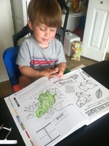 At thirty-four months, Xander is: ALL ABOUT his tricycle (he’s really starting to figure out how to steer it); super into getting dressed by himself (socks and shoes and all…go, Xander!) and picking out his own clothes; showing a lot of frustration towards Roman (thankfully, seeing Jonas go through the very same thing with Xander, is affording me a little bit of perspective); starting to try to color inside the lines all of his own accord and to use his scissors to cut on a line that he draws; dropping his afternoon nap several times a week; and totally loving apple juice, floor puzzles, and The Ladybug Game.