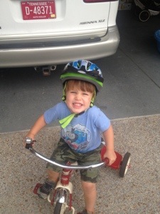 Xander is starting to share a little more and throw crying fits a little less (hopefully this is the beginning of a new phase). He read his first word, “love”, on his favorite “All You Need Is Love” Beatles shirt several days ago. And he’s getting geared up for preschool with his new backpack (he liked Thomas the Train) and his new rest mat cover (he picked out a really great fabric for me to make him one with white shooting stars on a red background…I loved that he gravitated towards a non-kid/non-charactery fabric…so cool). He’s also riding his tricycle like a BOSS (he got away from me the other day on it, pedaling steady as she goes up two big hills…and I was running like a crazy woman to keep up with him).