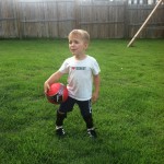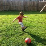When he went into the backyard to test everything out before dinner, Xander wanted to take a turn not with just kicking the ball but with wearing the shin guards and cleats as well. We just so happened to have some extras in the closet from our sweet next door neighbors who have three older boys…everything was a little big but it did the trick.