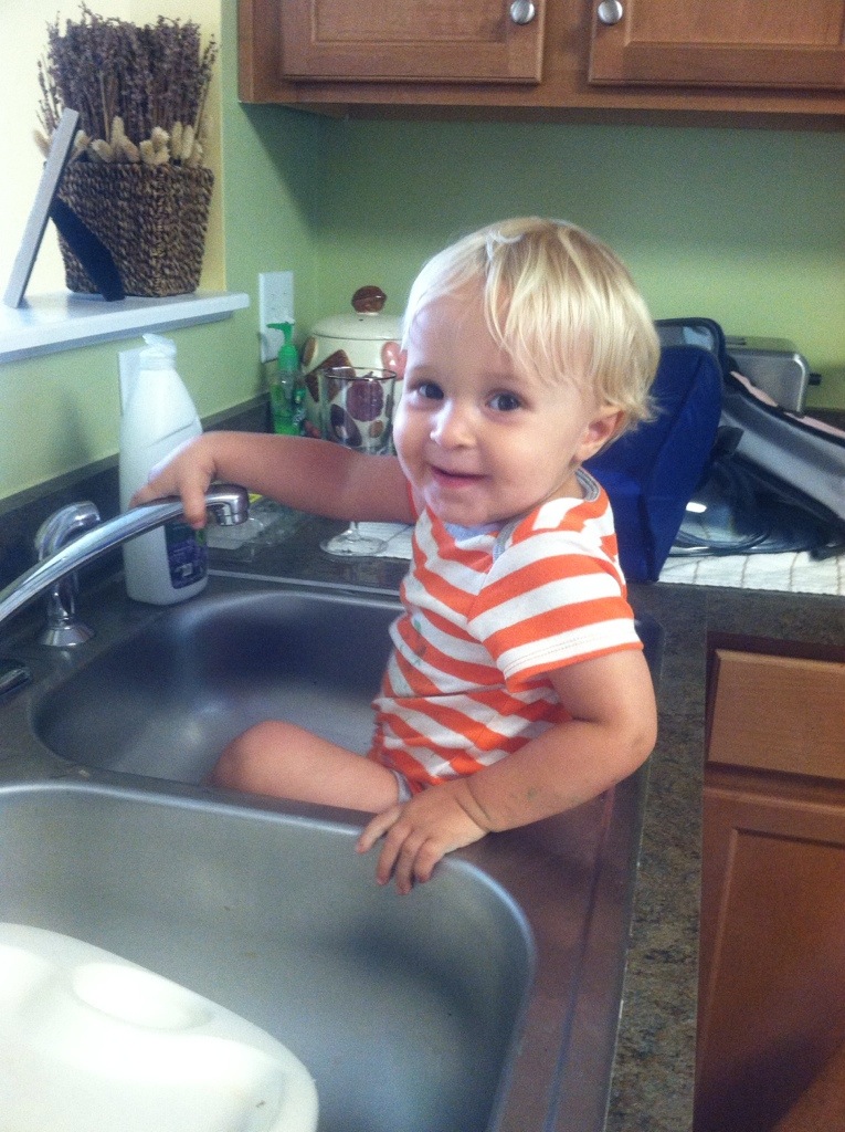 In his eighteenth month, Roman is: verbally ALL OVER IT, saying things like “too” and “turn” and “share” in regards to his brothers , “yay” and “happy” when he’s having a good time, “nd” when his sippy cup is “empty” and “lahloh” for “water”, “now” like Mommy does when he’s all set after getting his hands and face cleaned up after a meal or after a diaper change and “hands” when he wants to wash his hands, “but” for “belly button”, and “breat” for “break” and “peat” for “peach”; delving into two and three word combinations like “Wow, fish bath!” when he saw the fish in the aquarium at the zoo and “Hi, fly fly!” when he saw a butterfly in the garden and “Go, GoGo!” when he cheers Jonas on at soccer games, “up high” and “down low” which is one of his favorite games right now, and my personal favorites…”GoGo” for “JoJo” and “ZanZan” for “XanMan”; doing a lot of pretend play; going down the stairs; taking one afternoon nap; wearing us out with his incessant climbing; and enjoying table time with stickers, dot markers, and play-doh.