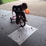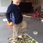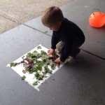 It was a rainy day today, so I busted out the contact paper, the masking tape, and two buckets of leaves the boys collected from a nature walk and let them have a go with creating fall nature collages in the garage. Jonas, by far, seemed to be the most into it. He did a mix of old leaves and new leaves on one, and then he discovered that Xander’s tricycle made really cool track marks on the other (he had a blast with that). I love the unedited creativity of children!