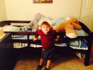 I was totally inspired by Kim and her five children…to buck up and do what needs to be done without a complaining heart (adding a little Mary to the Martha), to not carry shame about needing and operating on a household routine (enjoying the peace and freedom that can be found in order), and to start the big boys on helping with chores (preparing for the days when I can let go of more and they can take on more). So, I decided to start them on making their beds (to the best of their ability). It was so cute to see them get so excited about their task. Here’s one very proud Xander…