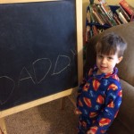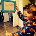 He’s been working on writing different letters here and there since this summer, but this was the first time I’d seen him write more than one letter in succession. I guess when it clicks…it clicks. (His preschool teachers started the Handwriting Without Tears curriculum this semester.) It’s funny how things go…I had just picked up a HWT workbook and flip crayons from our preschool director a few weeks ago and talked with her about Xander’s learning style. She had some brilliant suggestions for working with his personality including letting him try letter writing on cookie sheets filled with salt or shaving cream, chalkboards, dry erase boards, or magnetic boards because they’re not as committal and permanent and intimidating as pencil and paper. Amazingly enough…without having even talked with Tom about it…he brought home a combination chalkboard/dry erase board easel that afternoon that he found on free cycle for the boys. And they are all having a blast with it…Xander especially. Here he is with a few things he came up with this weekend: