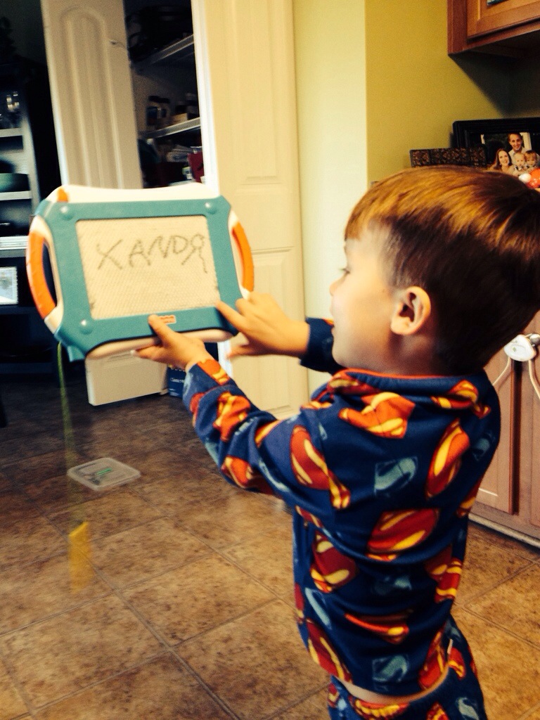 Lately Xander is all about: buttoning (his favorite pajamas and shirts to wear are button-down); changing clothes (he changes clothes just for the fun of it several times a day); running naked around the house (as much as he’s into the mechanics of clothes with buttons and zippers and changing his look, he’s even more into stripping down and streaking the house); writing his name; working puzzles of the United States; doing jumping jacks (he gets a big smile on his face and says, “Mommy, can I show you this?” and launches into the most joyful set of jumping jacks you’ve ever seen); and measuring his fullness at each meal by placing his hand at varying heights on his body and saying, “I’m full up to here.”