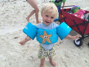 At twenty-eight months, Roman is: having a blast playing in the pool (in the front yard, in the backyard, and at the rec center with Mommy and Daddy while Jonas and Xander take swim lessons); enjoying a bit of gardening; getting excited to help out with driveway lemonade stands; and loving a visit with Audrey and his first visit to the beach.