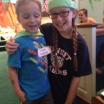 We missed VBS at our church this summer as we ended up going on vacation the same week (next year I’ll double check that before we book anything), so the boys ended up going this week to a little church down the road. It was much smaller and less overwhelming, and there were lots of familiar faces from our neighborhood. They learned about the twelve tribes of Israel and had a blast doing it. (I was so excited that Xander actually went…when the sweet girl who babysits for us saw him when we were picking up Jonas on Monday, she asked him if he wanted to be in her tribe for the rest of the week and he said yes!) Here my big boys are with their precious tribe leaders (both of whom I taught in the library years ago).