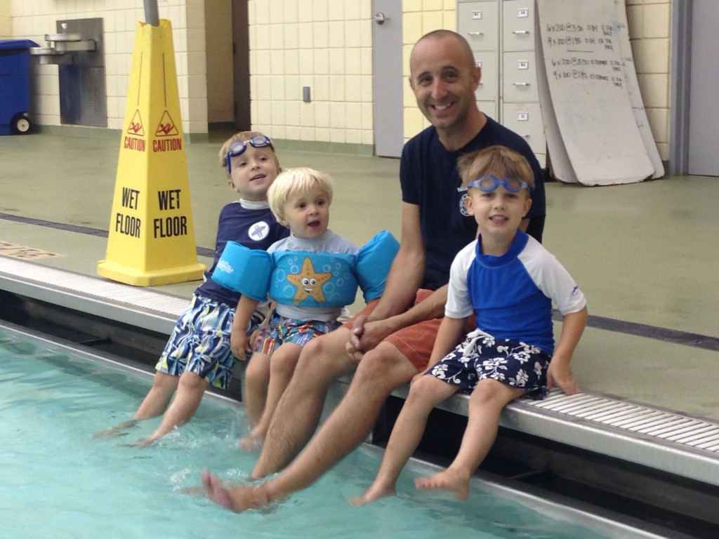 The big boys have started up a round of swim lessons on Saturday mornings. They are having fun and learning a lot. We usually try to get Roman in the pool with one of us during their lesson so he can kick around…otherwise he’s making a mad dash for the pool from the bleachers or he’s squealing and running in the hallways trying to get to the pool…if you can’t beat ’em join ’em. (He’ll be old enough to start lessons in the spring which I know he’ll be beside himself excited about.) Tom went with us today, so he got to join in on the fun.
