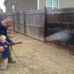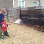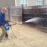 Tom pressure washed the treehouse and the patio this weekend…the boys were all standing up on the deck, watching him in awe. Â He asked if they wanted to try it, and they all jumped at the chance and had a BLAST spraying down the old chalkboard.