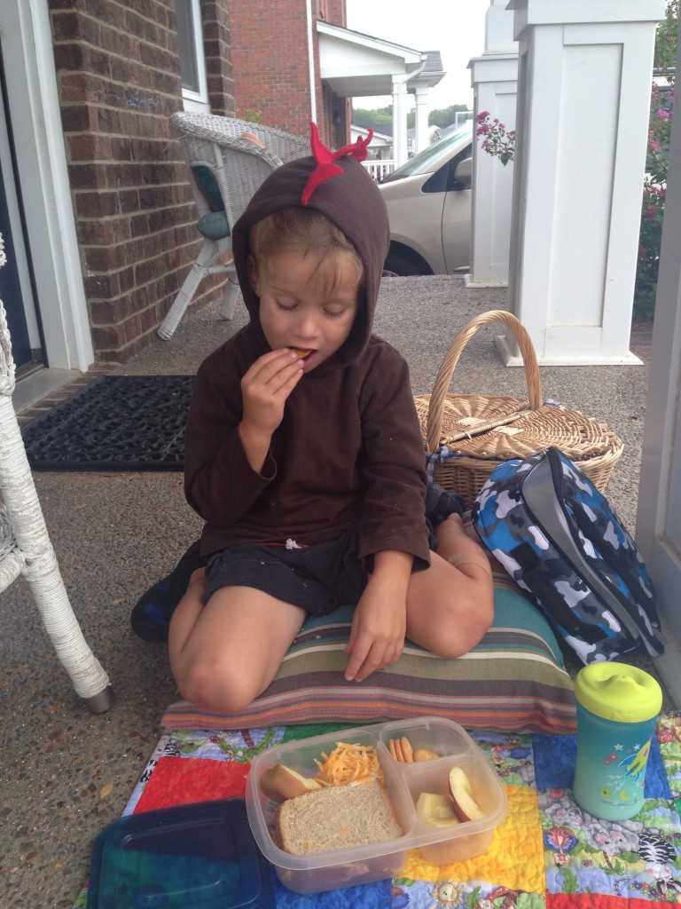 Xander had his kindergarten screening today, and Mommy needed some quiet special time with just him beforehand. Â So, the bookends (Jonas and Roman) had play dates with dear neighbors, and Xander and I had a picnic lunch on the porch. Â It’s amazing how time slows down in moments like that, and you look across at your little guy and marvel at the boy he is and the man he is to become. Â Precious. I love my Xan-Man!