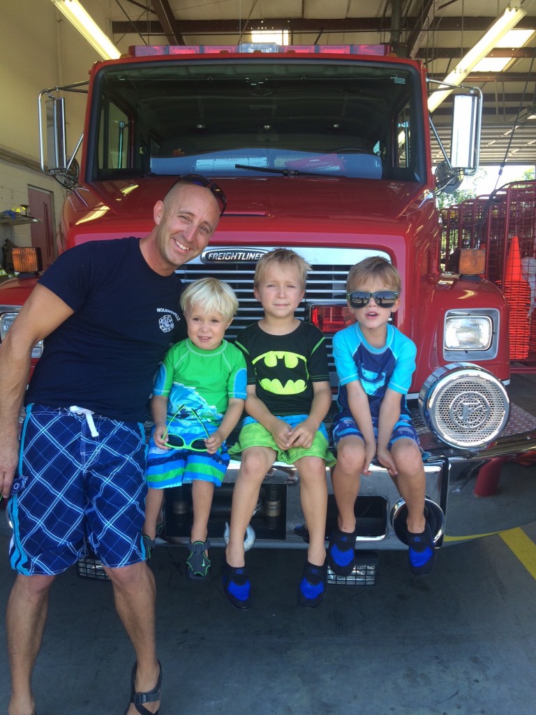 The boys spent the afternoon at the NVFD, with a load of other kids from our moms’ group…checking out the firetrucks, running in the water from the fire hose, donning themselves with fire hats (donated by the fire department) and sunglasses (donated by Publix), and eating ice cream treats (donated by Publix). What a fun summertime gathering…I’m so grateful for our community.