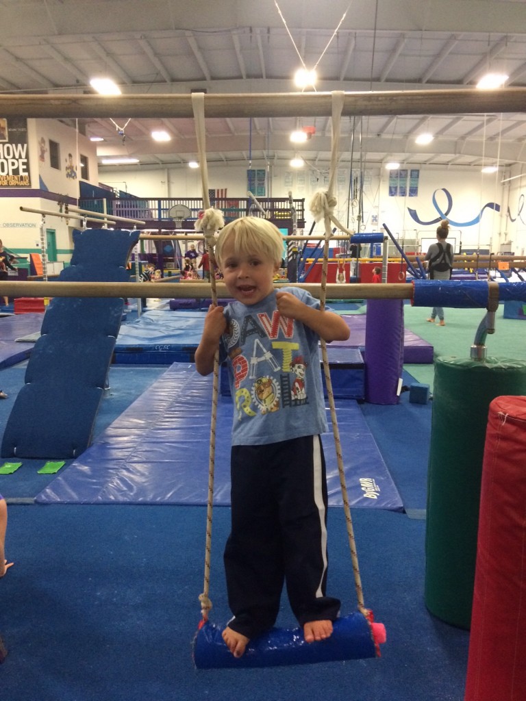I took Roman to Let It Shine gymnastics this morning to play with his dearest friend, Addie. He had a blast playing with her and running around checking everything out. His gym favorite by far was the zip line. Here he is monkeying around.