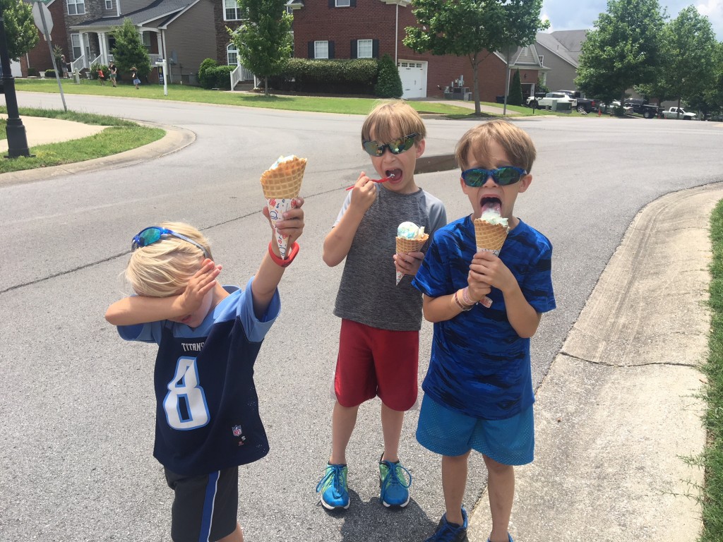 Today was the last day of school. The boys were so excited that the Bruester’s Ice Cream truck was parked in our neighborhood to help them ring in the summer. Here they are with their huge waffle cones of birthday cake ice cream…