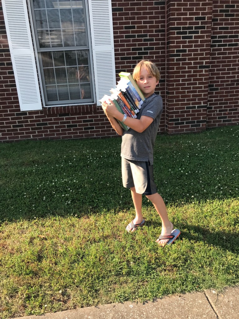 Jonas and I swung by the library this afternoon, and he picked out a huge stack of books. I sent this picture to Tom and he said, “That should get him through the weekend.” So true…he had already read five books by bedtime!!! And that is why both of his 4th grade teachers gave him the “Super Reader” classroom award.