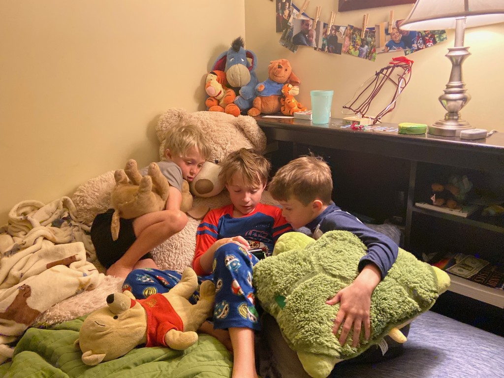 Before the lockdown, Jonas was heading home from the library pretty much every day with an armload of books. That boy is a voracious reader. So, when the library closed, I got in touch with Aunt Julie about that old Kindle Paperwhite of Dylan’s that he’s not using anymore. We’ve been able to load it up with books from my Libby app (if you don’t have it, get it…it’s a wonderful way to read or listen to books from your library), and Jonas is one happy camper. When Tom woke up on Monday morning, he found Jonas all cuddled up in the bed with his brothers and his stuffed animals, reading to them. So precious. What a blessing…thank you, Aunt Julie and Dylan!!!