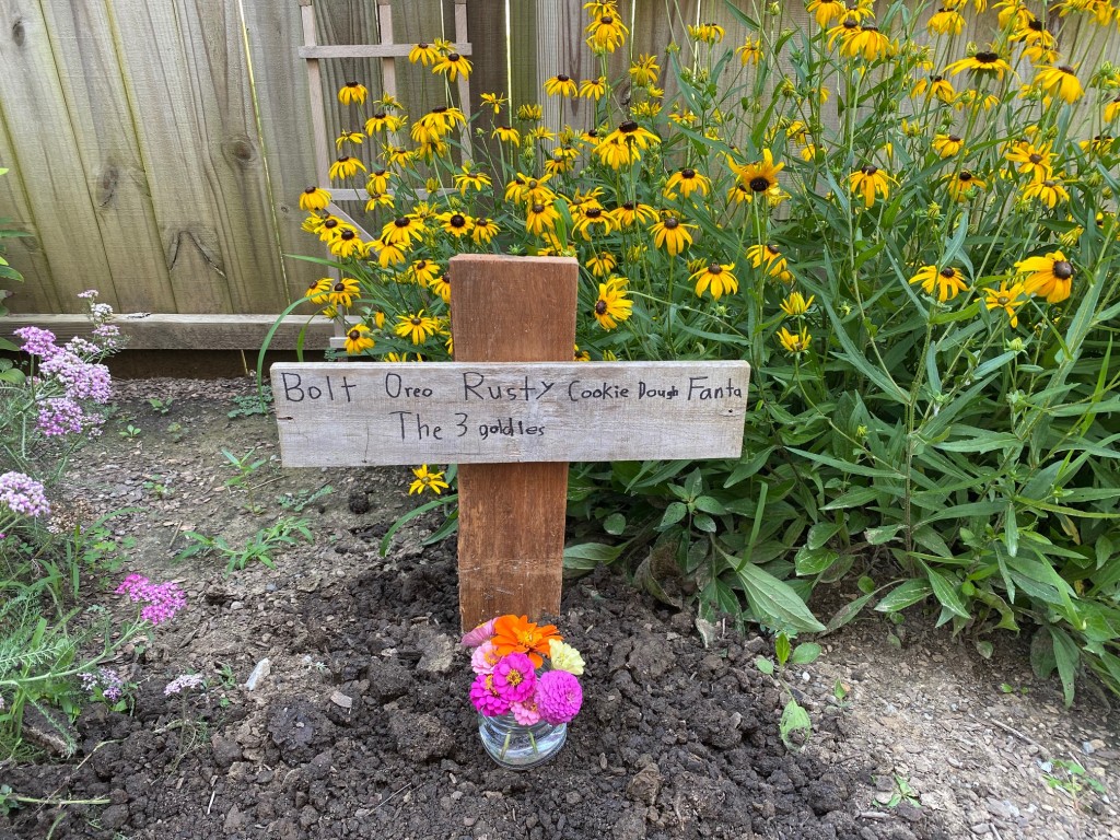 Our little backyard fish pond was so full of algae that you could hardly see the fish anymore. So, Tom spent the afternoon, cleaning it out, which is quite the task. After Tom caught all of the fish and put them into the bucket to wait while he cleaned, we were amazed at how many more we had than we started with. Roman and I really wanted to inventory the fish, so he took pictures and I wrote down the descriptions and names of each fish. We noticed very soon after that they looked really stressed out and thought it might have been from them being moved and handled or maybe because the new water was colder than the old water. Then, as they started floating on their sides, Tom realized that he needed to add de-chlorinator to the water (it was a different process when we set up the pond because the water had been sitting there for so long before we added fish). Long story short, we lost about half of the fish…including our three big beautiful koi (Oreo…black and white dappled / Rusty…black with a reddish/burnt orange tail / Cookie Dough…black with a white tail), two goldfish (Fanta…white with an orange tail / Bolt…all orange…he was Xander’s), and the Three Goldies (golden colored baby goldfish). It was so heartbreaking…especially for Xander, as he lost his fish…his favorite fish. He cried all night and the next morning. We decided to bury them in the garden. So, Tom dug a hole in between the yarrow and the Black-Eyed Susan’s and laid them all together in the ground. Xander called them each by name and bent over in half with grief. He has the most precious heart for creatures and always has. I told him that maybe he could make a cross to mark their grave and put their names on it. So, he did. A little while later, I was cutting zinnias for a little vase in my bathroom. Xander said, “Are those for the fish, Mom?” with his big, teary, blue eyes. I said, “Sure, buddy. Do you want a flower for each fish?” He said, “Yeah” and started crying again. He picked out an orange zinnia in honor of Bolt. It was a sad day.