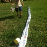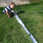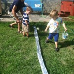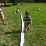 While Roman was napping this morning, Tom helped me try out a fun idea for Jonas and Xander…a Tin Foil River. (It’s so easy to do…just roll out tin foil, fold it in half lengthwise, bend up both sides to create a border, and set the garden hose at the top and let it run.) It was fun to see which things floated and which didn’t…we tried flowers, sticks, mulch, a ping pong ball, a bottle cap, cherry tomatoes and strawberries from the garden, etc.