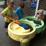 We were out in the front yard this morning, just tootling around…Jonas and Xander were playing with bubbles, and I had set up the water table for Roman. Pretty soon after, Roman found a big clump of mud on the driveway and squished his hands in it and then proceeded to smear it on both sides of his face and all over his chest. I’m talking Native American warrior here. He climbed up into the water table because he’s not much for just standing around, so I decided to just rinse him off a little bit with the water. Then, Jonas and Xander started grabbing dirt and mulch and leaves and flower blooms and dropping them all in the water table, complete with neon plastic frogs and snakes and lizards…a wooden spoon and a few plastic shovels later…and what do you have?!? Mud soup. Some days you just have to go with it, right?