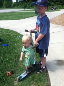 The boys and I had a real treat this morning and got to meet Aunt Heather and Cousin Val at the park for some play time and bring them back to our house for lunch. I love it when the boys play together, and it was so good for my soul to spend some quality time catching up with my sweet friend and cousin, Heather. Roman was ALL about Val, and Val is so good with him. Here they are at the park with the scooter…so adorable.