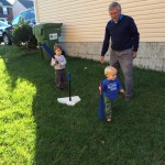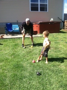 We busted out the croquet set this weekend. I have to admit…I was nervous about what it might look like with both Jonas and Xander wielding croquet mallets. But they actually did really well with it. (Xander didn’t quite get the fact that your turn is just one hit…even if you don’t make it all the way through the wick AND Jonas was trying to weasel in better ball positions with a quick kick or pick up of the ball every now and then BUT hey…they’re 3 and 4 and 1/2). I love to play…it’s amazing how I was instantly taken back to playing croquet as a child with my Grandpa and my Daddy, both the most measured and gentle of teachers. So, I was so happy when PaPa stopped by this morning and hung out for a little while and was able to give Jonas a few croquet pointers.