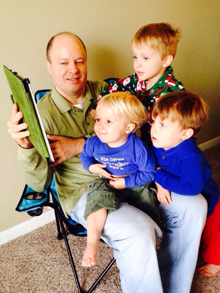 Uncle Kerry is home to stay after almost 17 (count them) years in Taiwan!!! I mean…huge. We are so excited that he’s here. The boys and I ran by his house this morning (they were still in their pajamas…ha) to deliver a homemade caramel chocolate almond covered apple Christmas treat (thanks to Aunt Tree for the recipe). He showed us the most beautiful and inspiring slide show of his hike to the base camp of Mt. Everest. (It’s good for me to be reminded of how big and wonderful our world is…I can’t wait to see more of it.) Here he is with a captive audience.