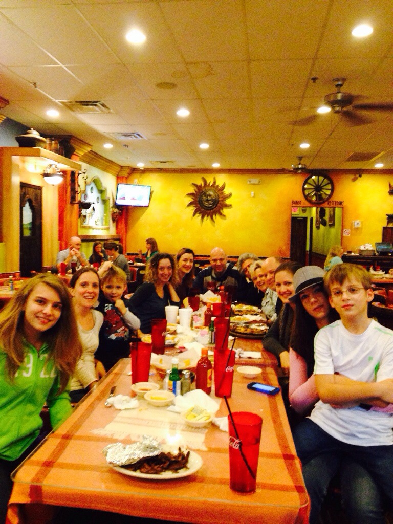 It was SUCH a treat to meet my brother, Darren, and my nieces, Kaia and Marina, who are visiting from Norway for the holidays…for lunch today!!! Everybody made it out, which made it even better, except for Tom, Xander, and Roman (daddy stayed home with the napping boys) and my nephew, Rueben (he couldn’t make it over from Norway this year, and we are all so BUMMED…it’s not the same without him). Jonas and I had a wonderful time just hanging out. Here’s a picture of the whole crew. We’re looking forward to more family time…
