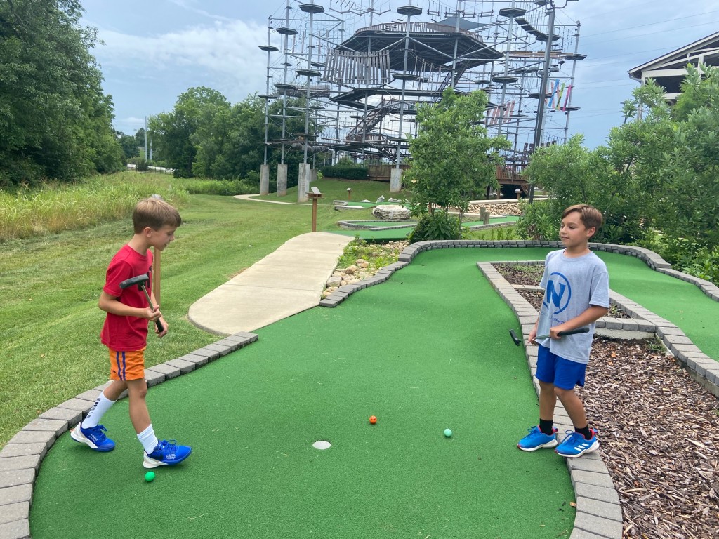So, they switched gears and ended up playing miniature golf there (and getting vouchers to do the ropes course another day) and doing some geocaching.