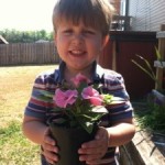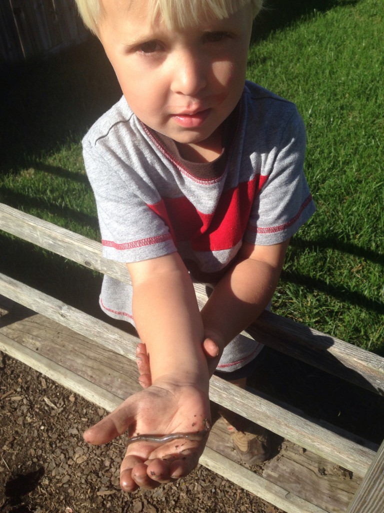 Roman and I worked in the garden this afternoon. Â He helped me: Â pull out the Zinnias that were on their way out (cutting some to put in a mason jar to enjoy indoors and saving the spent blooms to dry and replant next year); plant some cool weather vegetables…Broccoli, Kale, and Red Romaine Lettuce; and cut back and replant a clump of Black-Eyed Susans. He even found a worm friend that he put in a bug catcher with some dirt (it’s “sleeping” in his room at night on the dresser and spending the day hanging out in the garden. Yay for a beautiful fall day, digging in the dirt with Roman!