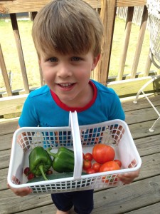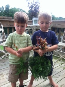 The boys and I dug up some of our carrots from the garden this morning. (Some of them weren’t quite as ready as others…see the ones in Xander’s hands…but we’re still learning which ones to pull up and which ones to leave in the ground…Xan-Man loves “the baby ones” anyway, so no loss.) As I was digging them out (I love the look of them fresh from the garden with their green tops and clumps of dirt), Jonas said, “Mommy, maybe that’s why we have rabbits in our garden because we have so many carrots!” True, true…we have a little furry friend who has made a home under our huge rosemary. Yay for carrots fresh from the garden and yay for little boys who love to hold, wash, and eat them!!!