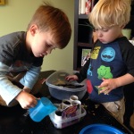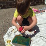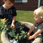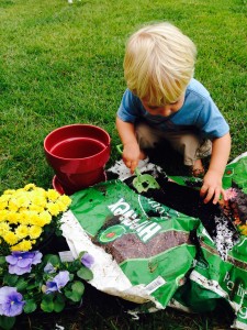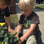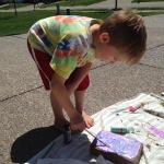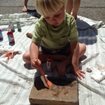 The boys and I spent most of the day outside today…we planted our corn, bean, cucumber, and carrot seeds and our tomato and sweet pepper plants and painted pavers for our garden. Here they are…hard at work on their creations: