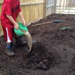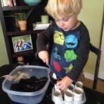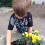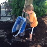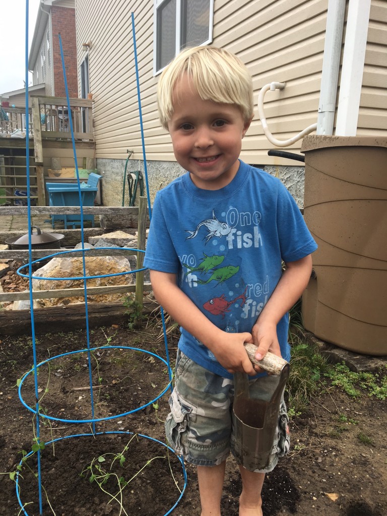 Roman planted some beans in a cup in his preschool class, after reading Jack and the Beanstalk. He’s been taking very good care of them at home, while they’ve been sprouting up…watering them and finding just the right light for them. He was so excited to help me plant them in the garden this morning…