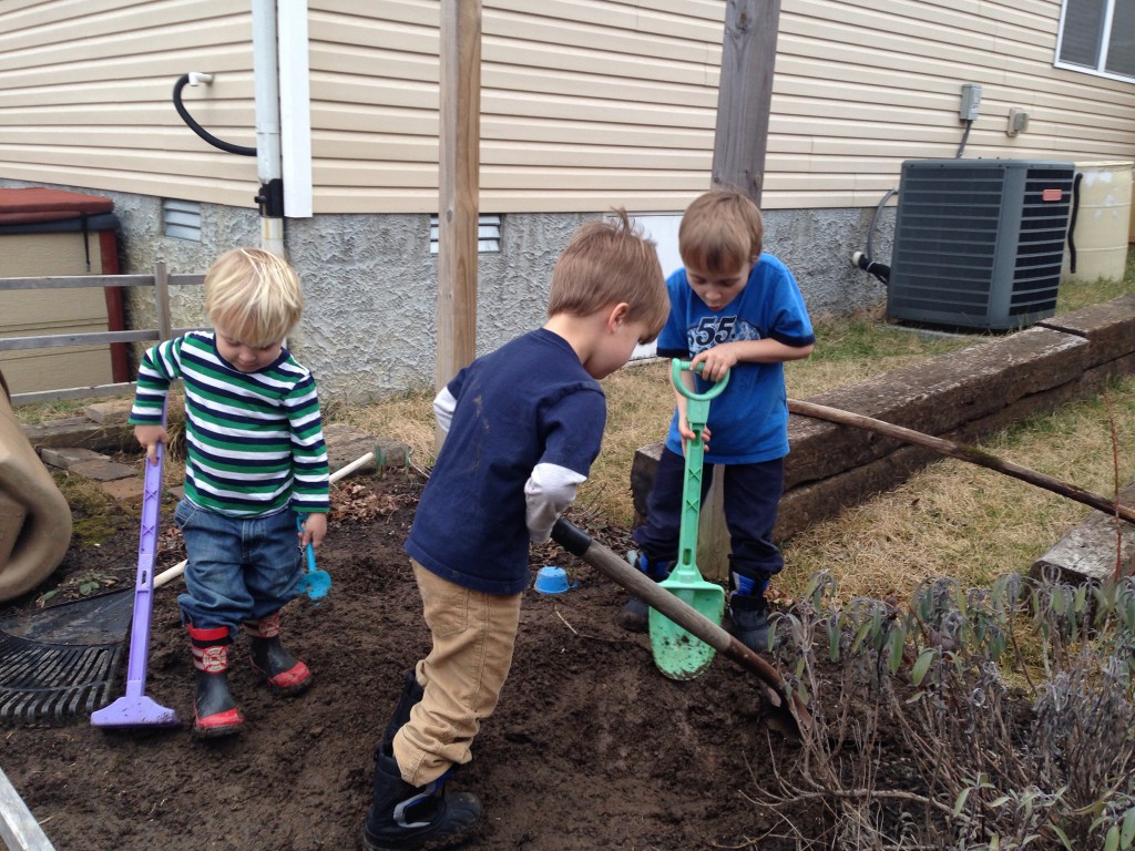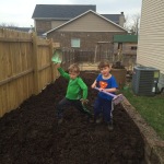As a nice ending to spring break, Tom had the dirt delivered for the new addition to our garden!!! Â We all enjoyed helping out. Â Tom shoveled and wheelbarrowed dirt, I tried my best to spread it out with a rake, and the boys amused the workmen with their little boy antics and got their hands and clothes as dirty as possible.