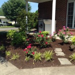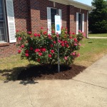 A few weeks ago, I noticed that the flower beds in front of the library could use a little sprucing up. Â So, I talked with the head librarian and got his okay on everything. Â Then, we were off to the races! Â The boys went with me in different configurations and I went by myself a few times over the course of several days to do some weeding, pruning of the crepe myrtle and roses, and cutting back of the dead monkey grass. Â The Mulch Stop donated 2 yards of mulch, and The Southbranch Nusery donated 6 small pots of lantana to put in the flower pots out front!!! Â I talked with another instrumental mom in our moms’ group, and she suggested putting it down as an event on our calendar and inviting moms and kids out to join us for a work day. Â She also suggested rotating with each other playing with the kids in the library (reading, coloring, etc.) and working outside. Â We brought snacks to share, and we had a great time! Â Laura brought the mulch in her truck, and it was amazing how much we were able to get done. Â There is no way it would have gotten done without everyone coming together. Yay for community!!! Â Here are a few pictures of the boys hard at work…