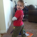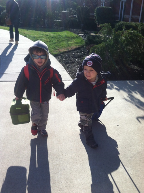 Today was Mis-Match day at Jonas’ preschool. He picked out a combination of camouflage, stripes, and tie dye with two different pairs of socks and shoes. You can’t really see his creative outfit in this picture, as it was freezing outside in the morning and he wore his coat, but I love this sweet moment of him holding hands with one of his best friends, Henry on the way in to preschool. Aw…so precious!!!