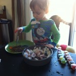 After Jonas and Xander woke up this morning (while Daddy and Roman were still sleeping), we enjoyed having a bowl of Lucky Charms with green milk and doing a fruity marshmallow rainbow sorting activity. Happy Birthday, Aunt Beans!!!