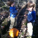 After Jonas got home from school and Xander and Roman woke up from their naps, Roman hung out with Daddy while I took Jonas and Roman on an “expedition” to find Xander’s shoe in the woods. Xander and Spencer were blazing trails in the woods left and right on our morning walk, and on their last trail blazing adventure lost Xander’s shoe. We didn’t have time to look for it at the time, as Roman was in desperate need of a nap. Anyway, Joans and Xander were SUPER excited to go exploring. (They especially liked the pumpkins, that for some reason, someone had left several of sitting out in the woods). After two run-throughs, we finally found it. Yay!!! And yay for the hint of spring in the weather and for an adventure in the woods with my little boys!!!