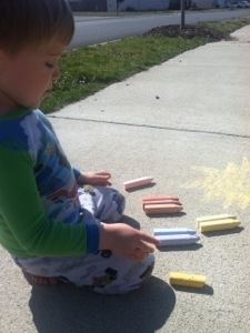 Jonas and I sat out front, soaking up the sun and drawing with sidewalk chalk this afternoon, while Xander and Roman napped. It’s so interesting to see how much his drawing changes every day. And, of course, I always get a big kick out of how much he loves to “organINize” just like his mommy (check out the sidewalk chalk…haha!).