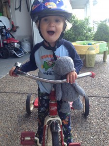 In his twenty-sixth month, Roman is: delighting in his newfound abilities to close doors, put on his shoes, buckle himself into his booster seat at the table, and pedal a tricycle; overjoying his Mommy and Daddy by finally getting the poop side of potty training after a loooooooong two and a half months; really getting into screeching; and cracking his brothers up at the table and in the car.