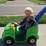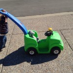 Roman and I went on a little walk this morning. He wanted to take his “car car”, his “dgink”, and his “ah ah”. Here he is taking a ride and giving a ride.